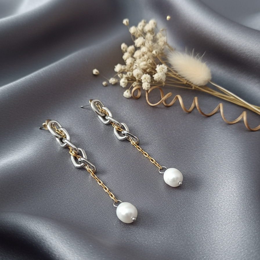Golden Drift Chain Drops earrings present a fashion-forward design blending polished gold-tone links with smaller...