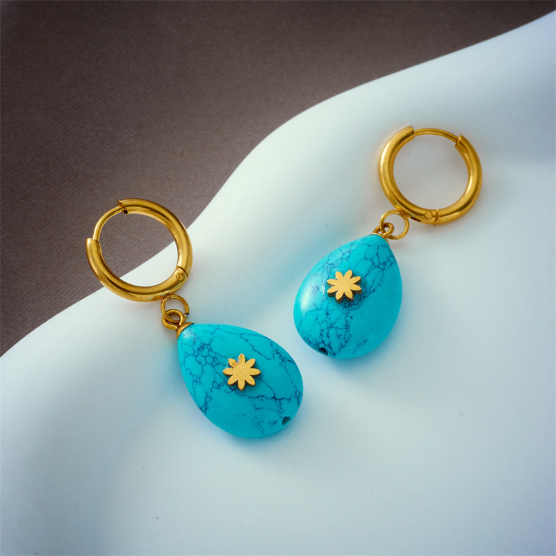 These earrings feature a bold and vibrant design. A small, polished gold-tone hoop serves as the...