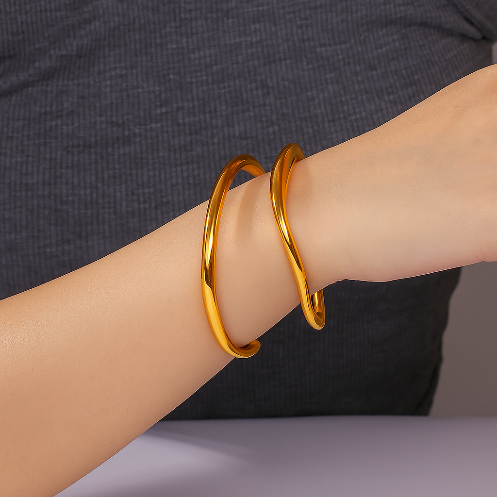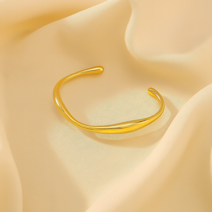 Crafted from gold-tone stainless steel, the Auric Curve Minimal Cuff showcases smooth, flowing curves in a sleek, open design. With a 6 cm diameter and a balanced weight of 18.1g, this bangle offers versatile sophistication, elevating everyday looks with understated elegance.