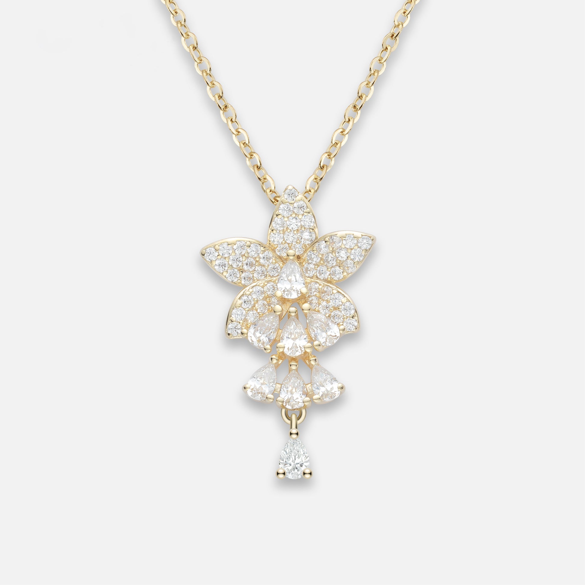 Elevate your elegance with the Diamond Bloom Symphony pendant. Crafted from 925 sterling silver, this exquisite piece is fully adorned with sparkling cubic zirconia, shaped into a graceful orchid blossom. Three delicate teardrop stones dangle with refined movement, capturing light to enhance your radiant presence with every gesture.