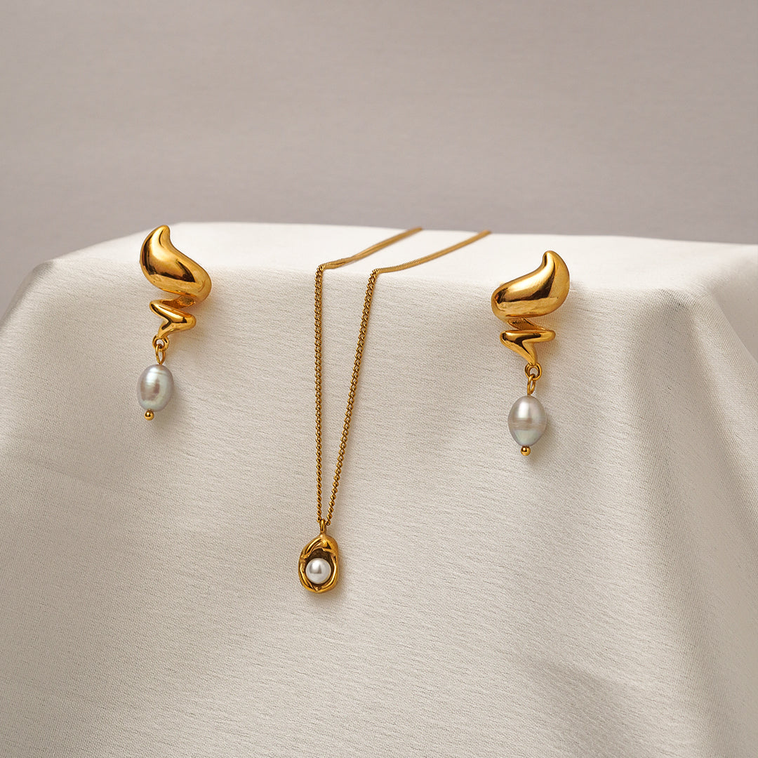 Elevate your style with the Molten Pearl Drape earring and Classic Pearl Halo Pendant set ✨. This exquisite duo features lustrous pearls gracefully draped in a molten design, paired with a timeless halo pendant that adds a touch of sophistication 💎. Perfect for both formal occasions and elegant everyday wear, this set brings together classic charm and modern artistry, making it a must-have for your jewelry collection. Add a subtle sparkle and refined elegance to your look with these stunning pearl accessories 💫.