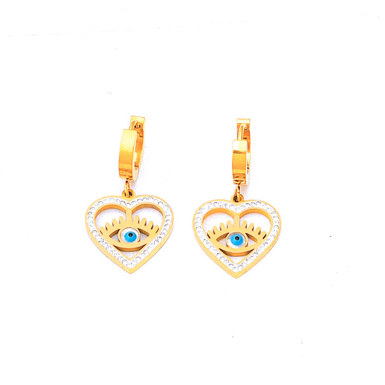 Sky Love Danglers earrings feature delicate hollow hearts in light gold, accented with subtle pastel blue details that complement a layered heart-and-bead necklace. Their long, lightweight design adds a soft, romantic touch, making them an elegant choice for graceful, everyday wear.