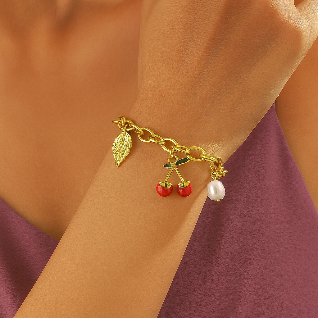 Elevate your style with the Turquoise Sol Drops and Cherry Whimsy Charm Bracelet 🌊🍒. Featuring vibrant turquoise beads that catch the light like drops of the sun, this bracelet adds a refreshing pop of color 🌞. The playful cherry charm brings a touch of whimsy and fun 🍒, making it perfect for both casual and elegant looks. Expertly crafted for lasting shine and comfort, this bracelet is an exquisite accessory that brightens any outfit ✨.